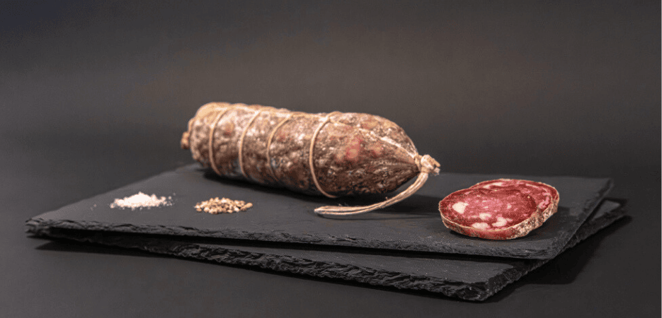 Diese edle Salami della Rosa der Agrisalumeria Luiset ist eine Rohsalami, aus den besten Stücken vom Schwein und nach einem alten Familienrezept gefertigt. Das hochwertige Schweinefleisch wird bei der Zubereitung mit Salz, Kräutern, Pfeffer und Nebbiolo-Wein verfeinert. Diese Art der Zubereitung verleiht der Salami nach der Reifung in einem kostbaren Naturdarm, auch Rosendarm genannt, ihren außergewöhnlichen Geschmack und ihr einzigartiges Aroma.