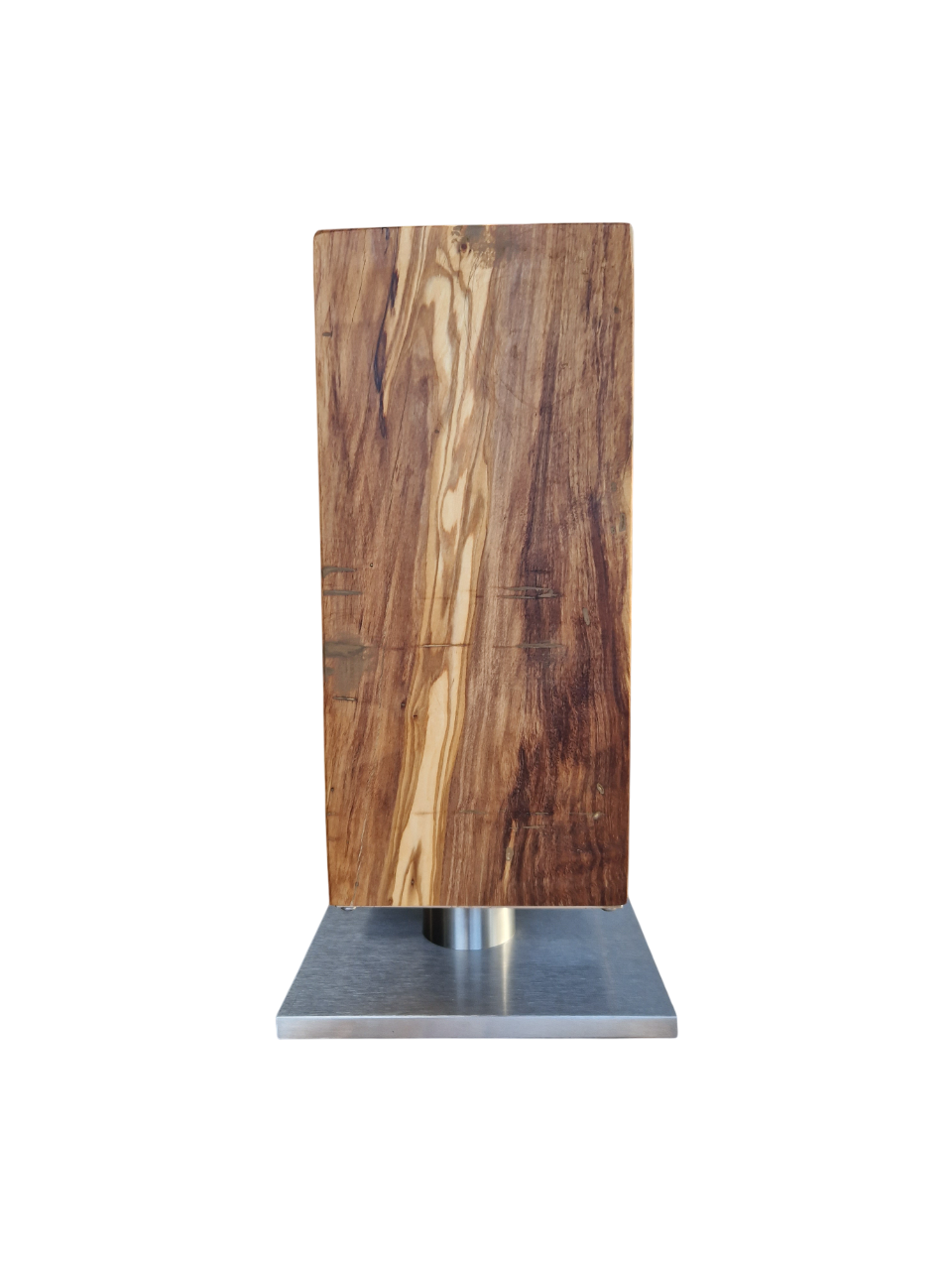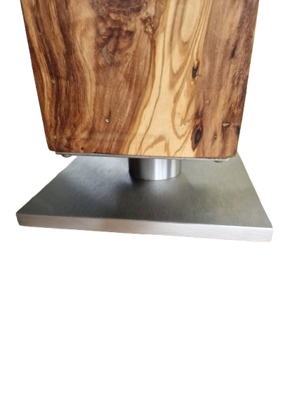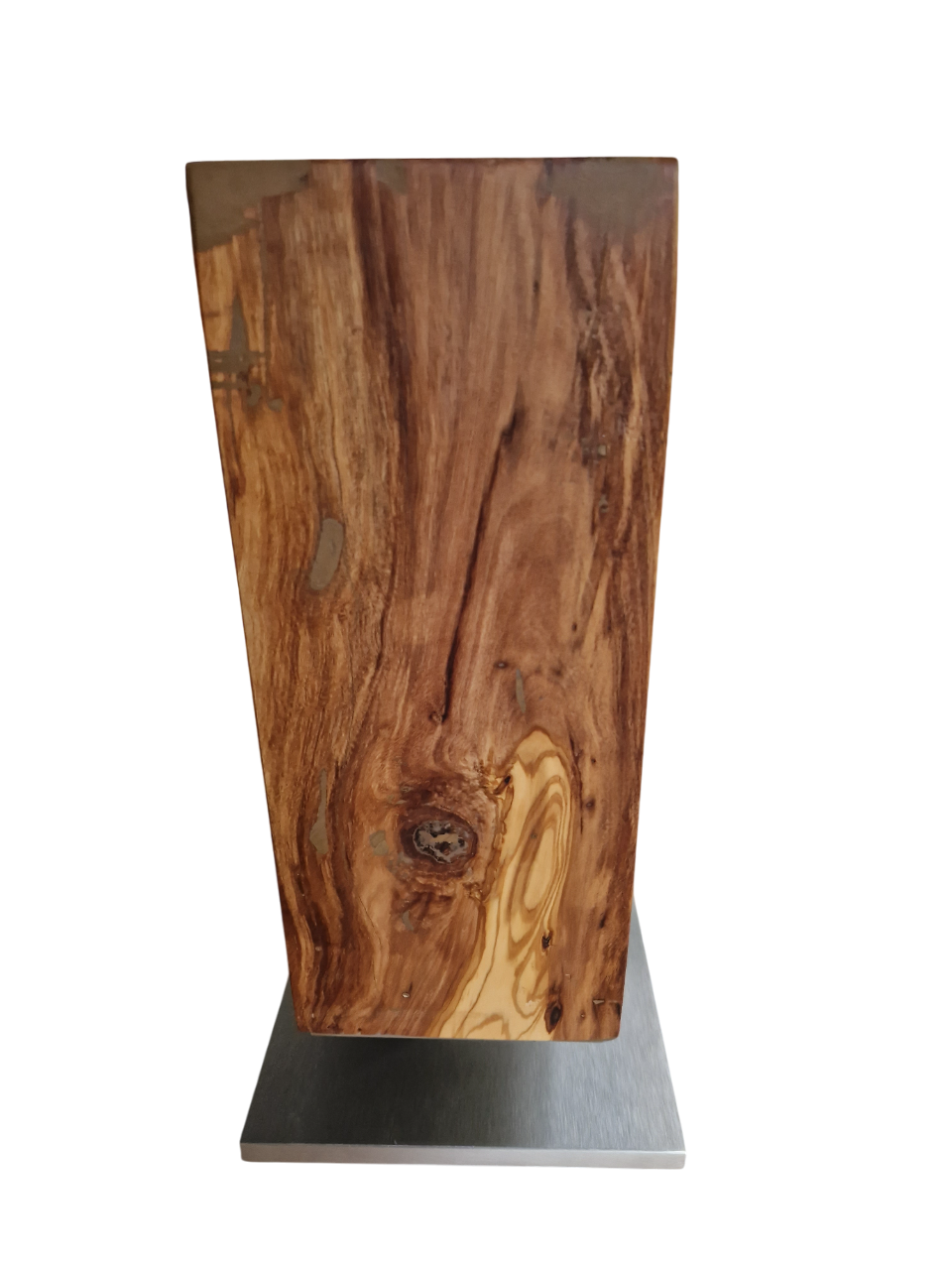 Dieser Messerblock ist aus einem massiven Stück Olivenholz (nicht aus zusammengesetzten Einzelteilen) gefertigt und damit in seinen Abmessungen und seiner Machart einzigartig. Absolut individuell und exklusiv ist die besondere Maserung des Olivenholzes - dieser Olivenholz-Messerblock stammt aus dem unteren Teil eines mehrere hundert Jahre alten Baumes. Das Holz geht eine außergewöhnliche Symbiose mit der matt polierten Edelstahl-Aufnahme ein. Innenliegend befinden sich auf jeder Seite mindestens zwei Neodym Magnete, welche in sehr aufwendiger und langwieriger Handarbeit in einem schmalen Schlitz unterhalb der Holzoberfläche in den Block eingebracht worden sind.